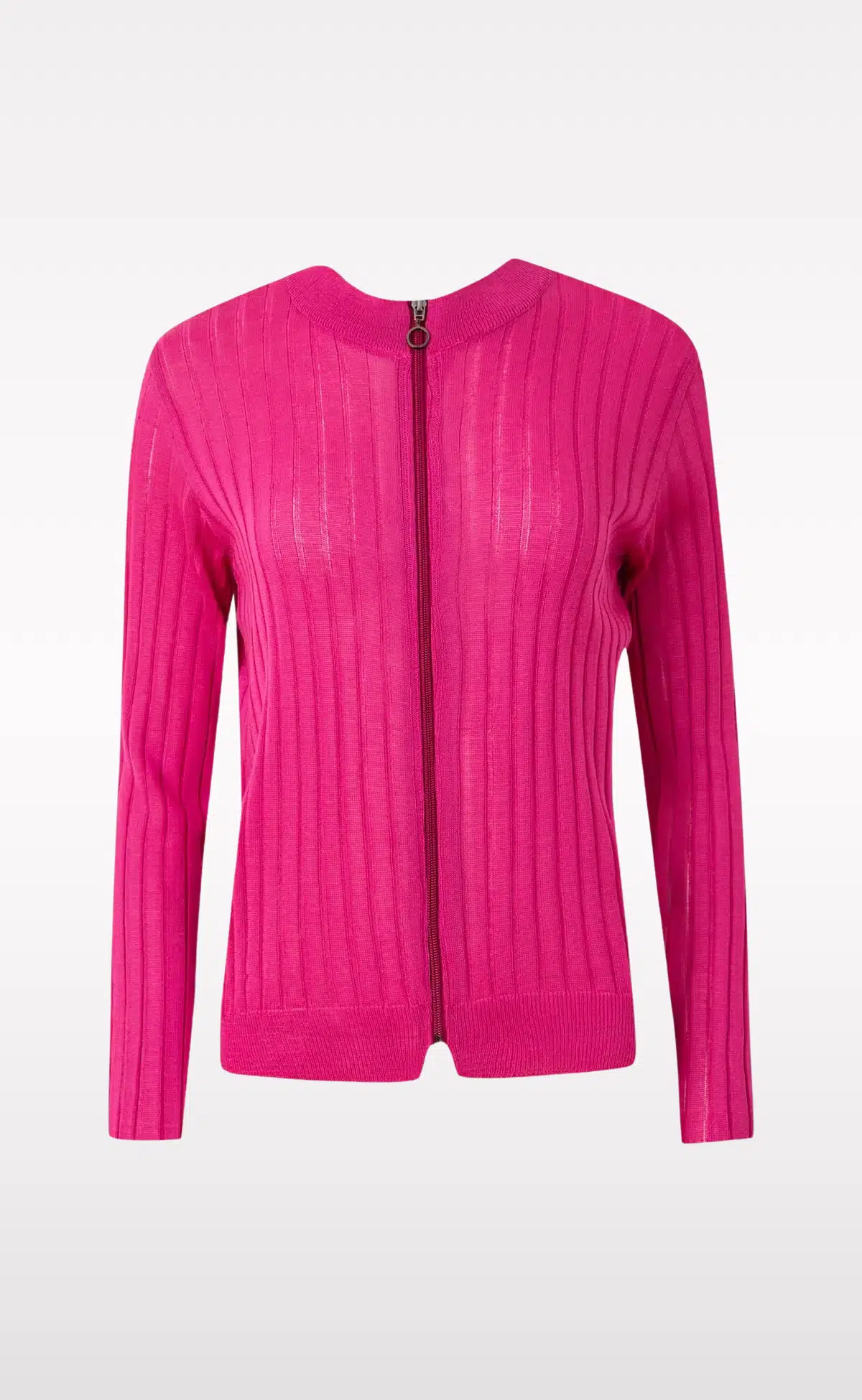 Εντυπωσιακό πλεκτό jumper σε φούξια απόχρωση, με ριμπ ύφανση και ελαστικό ύφασμα για άνετη εφαρμογή. Διαθέτει μπροστινό κλείσιμο με φερμουάρ, ιδανικό για stylish εμφανίσεις από το πρωί έως το βράδυ.
