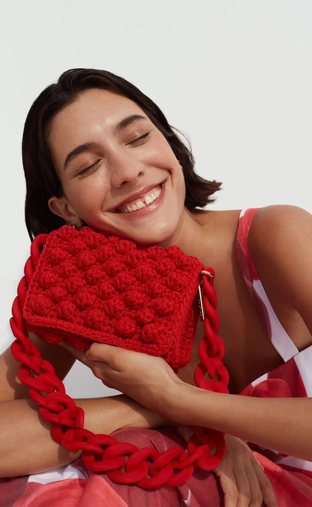 Μια μοντέρνα, μικρού μεγέθους τσάντα ώμου που θα σας κάνει να ξεχωρίζετε. Η καλύτερη επιλογή για μια ξεχωριστή εμφάνιση από το πρωί μέχρι το βράδυ. Είναι χειροποίητη από πλεκτό ύφασμα με μεταλλικό νήμα υψηλής ποιότητας και το εσωτερικό της είναι πλήρως επενδεδυμένο.