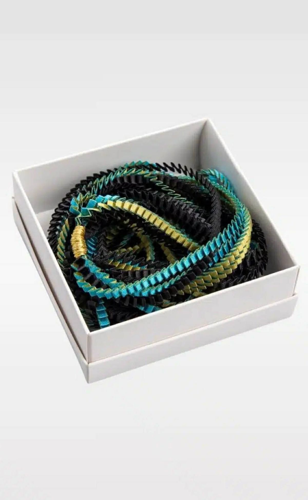 Αυτό το statement κολιέ θα κάνει κάθε σας εμφάνιση μοναδική! Κατασκευάζεται από πλισέ ύφασμα και ο τρόπος που κοσμεί το λαιμό ή το πάνω μέρος του ρούχου ποικίλλει ανάλογα με τους συνδυασμούς χρωμάτων και λάμψης. Είναι πολύ ελαφρύ και δίνει αέρα και στυλ σε κάθε βήμα. Έχει μαγνήτη που κλείνει, καθιστώντας το ένα πολύ ευκολοφόρετο κομμάτι που μπορείτε να συνδυάσετε με τις επίσημες εμφανίσεις σας, στο γραφείο ή με την καθημερινή σας casual εμφάνιση. ΣΥΣΚΕΥΑΣΙΑ ΚΟΛΙΕ: Λευκό κουτάκι από χαρτόνι μέγεθος 9x9x4εκ με αυτοκόλλητη ετικέτα στο καπάκι, με φωτογραφία από λεπτομέρεια του κολιέ τον κωδικό του χρώματος και το όνομά της σχεδιάστριας Αλεξάνδρα Τσουκαλά.