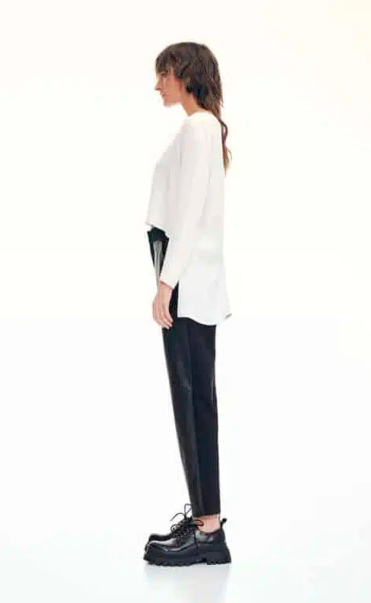 Τοπ με λεπτομέρεια «origami» από 100% silky βισκόζη. Έχει μακριά μανίκια, στρογγυλή λαιμόκοψη και ασύμμετρο στρίφωμα ενώ η πλάτη του είναι διακοσμημένη από ραφές εμπνευσμένες από την τεχνική “origami”. Ένα άνετο και παράλληλα stylish σχέδιομε διακριτική γυαλάδα, ιδανικό για day-to-night σύνολα.