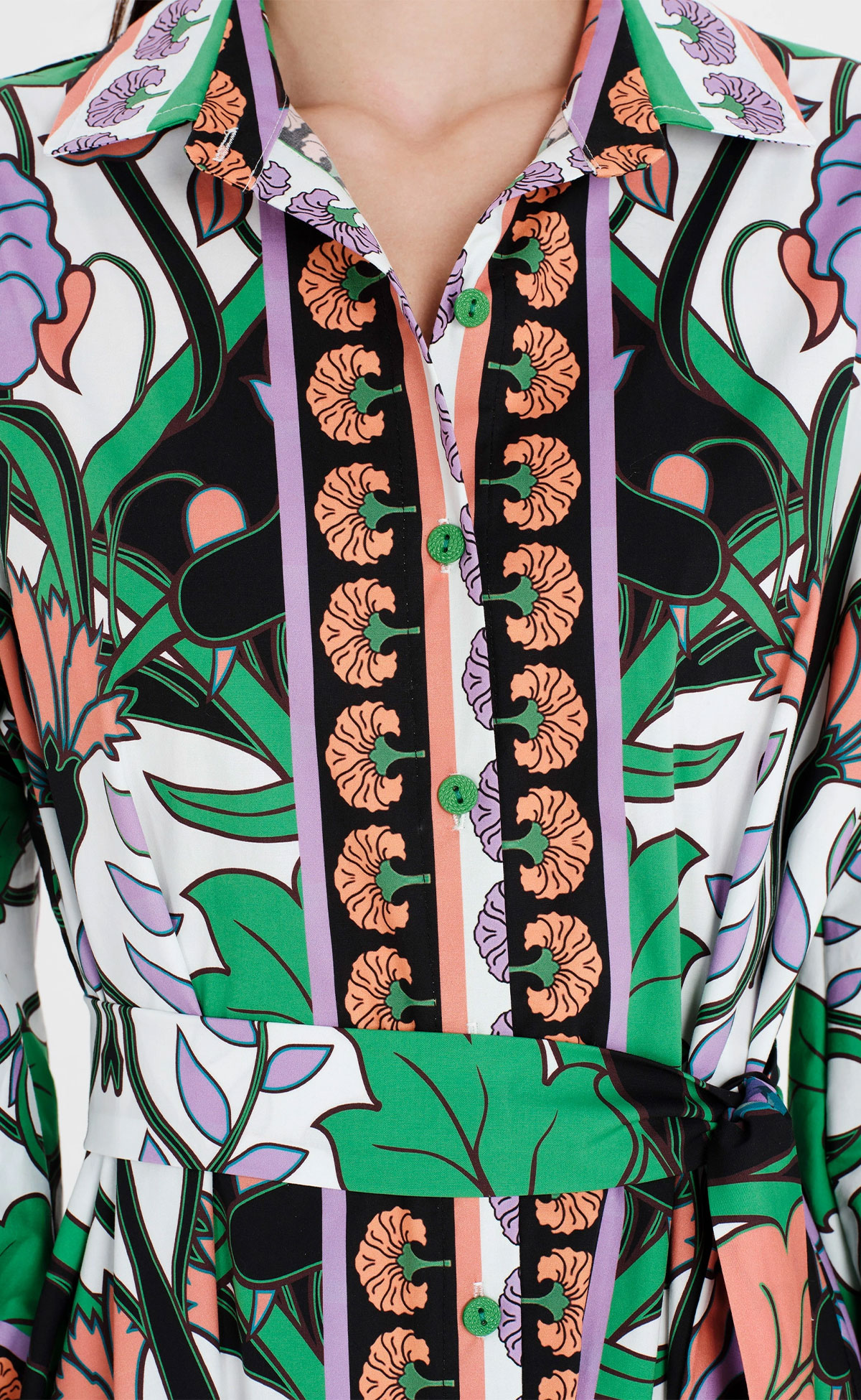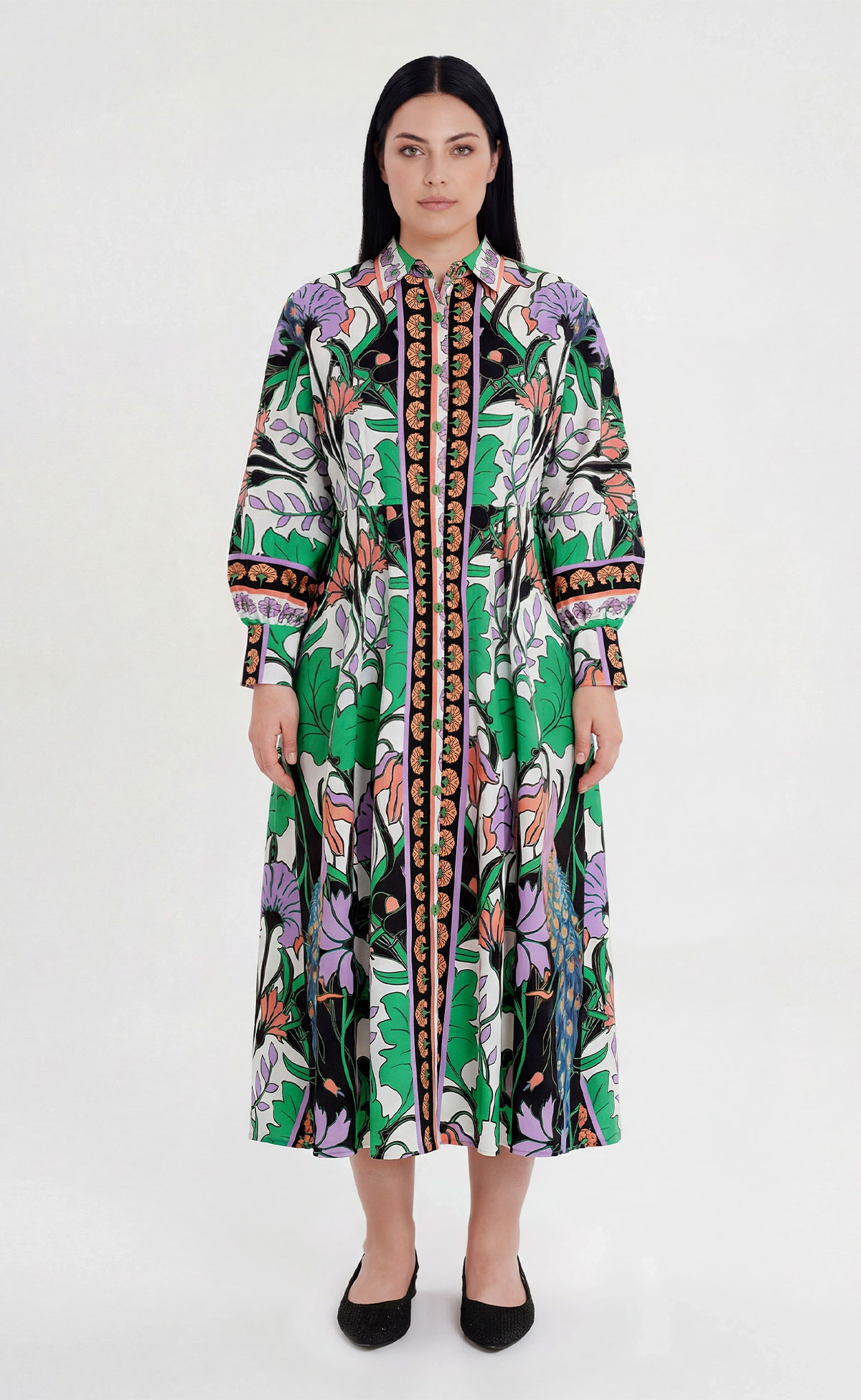 In an imaginative blend of all-over and placement prints, our Nostalgia Long Dress features dynamic colours, peacocks, and floral motifs. This button-front shirtdress has a subtly defined waist that flows into an effortless A-line silhouette, wearable with or without its belt. Crafted from cotton poplin with elastane comfort, the fabric gives soft structure while long, gathered puff sleeves with buttoned cuffs add whimsy. Perfect for spring and summer occasions or whenever you want to express beauty.