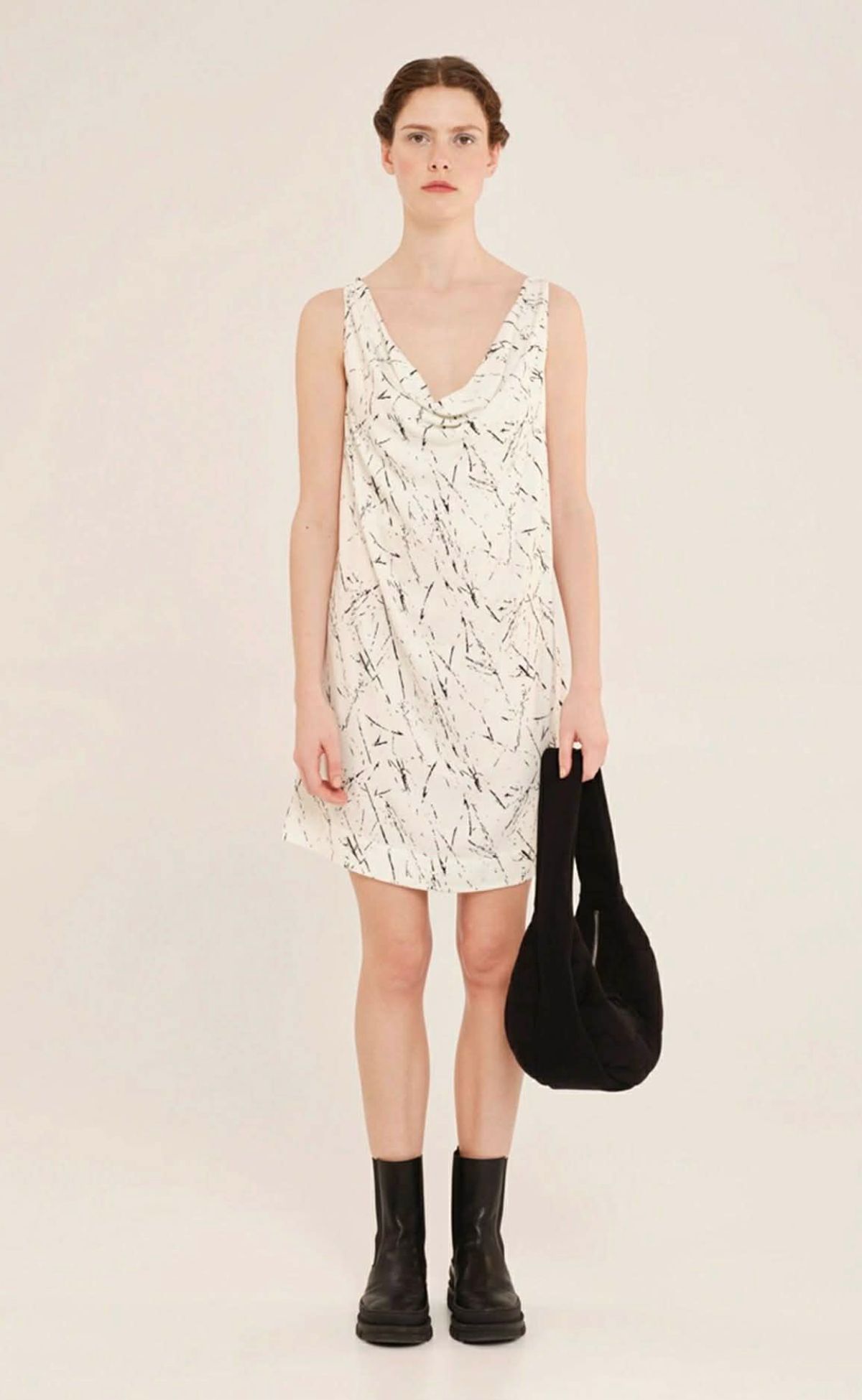 Μίνι φόρεμα από 100% βισκοζένια βιέλλα με απαλή υφή. Έχει άνετη, ίσια γραμμή και είναι αμάνικο. Στο μπροστινό μέρος διαθέτει ντραπέ σχέδιο που κολακεύει τον λαιμό, ενώ στην πλάτη ξεχωρίζει μια διακριτική, ελεύθερη πιέτα. Το ιδιαίτερο γραμμικό του print σε αποχρώσεις off-white και μαύρου θυμίζει αφηρημένες, λεπτές πινελιές, αναδεικνύοντας τη μοναδικότητα της συλλογής και την εκφραστικότητα του σχεδιασμού. Άνετο και κομψό, αποτελεί statement κομμάτι για ιδιαίτερες, cool και εκλεπτυσμένες εμφανίσεις.