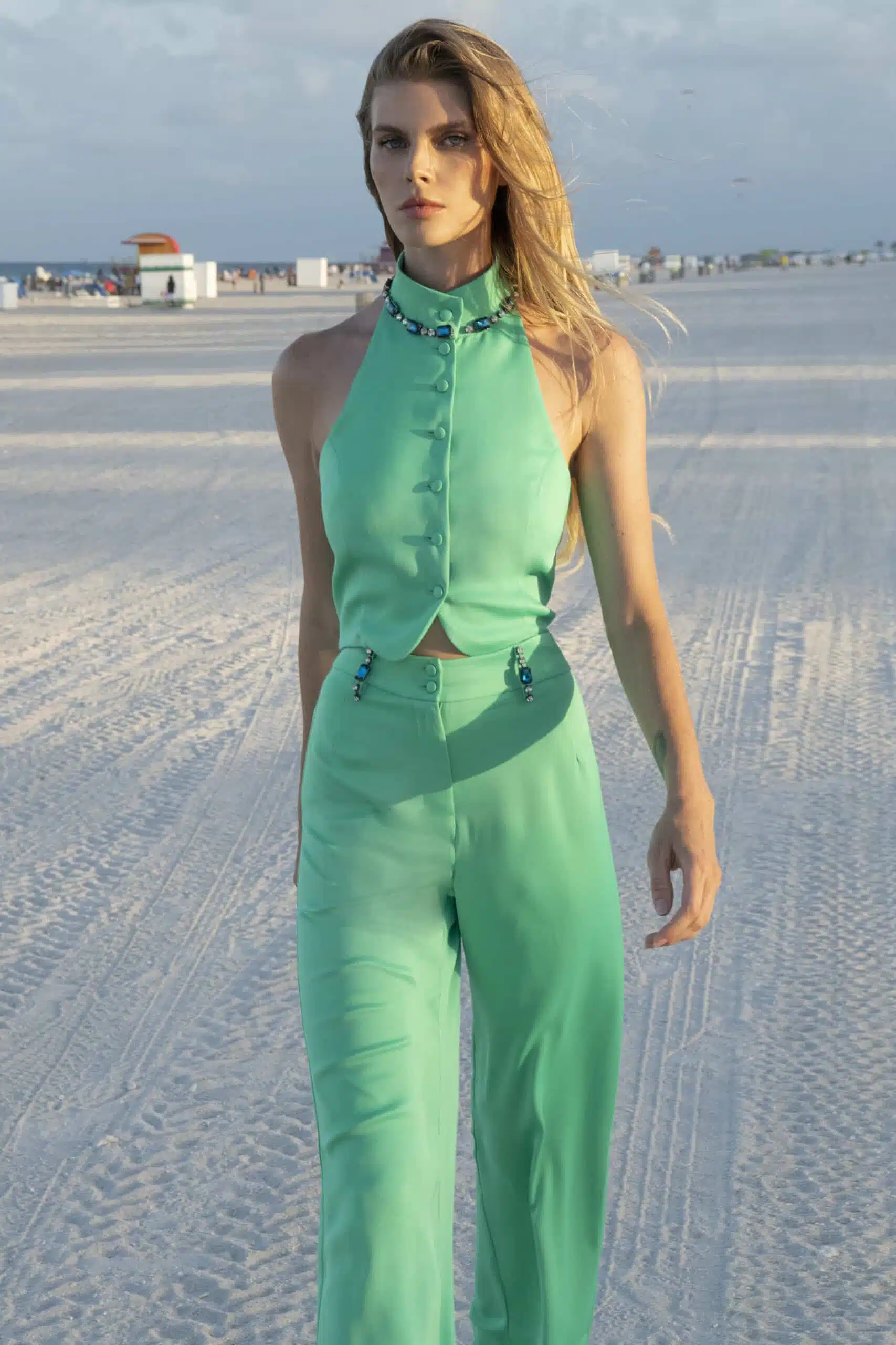Ανακαλύψτε το πράσινο silk παντελόνι της Stefania Vaidani, με υψηλή μέση και κομψές διακοσμητικές λεπτομέρειες στη ζώνη, που προσθέτουν μια διακριτική πολυτέλεια στην εμφάνιση. Διαθέτει πρακτικό κλείσιμο με κουμπί και φερμουάρ και προσφέρει άψογη εφαρμογή χάρη στην προσεγμένη γραμμή του. Ιδανικό για να ολοκληρώσετε ένα κομψό σύνολο, συνδυάζοντας άνεση και στιλ σε κάθε περίσταση.