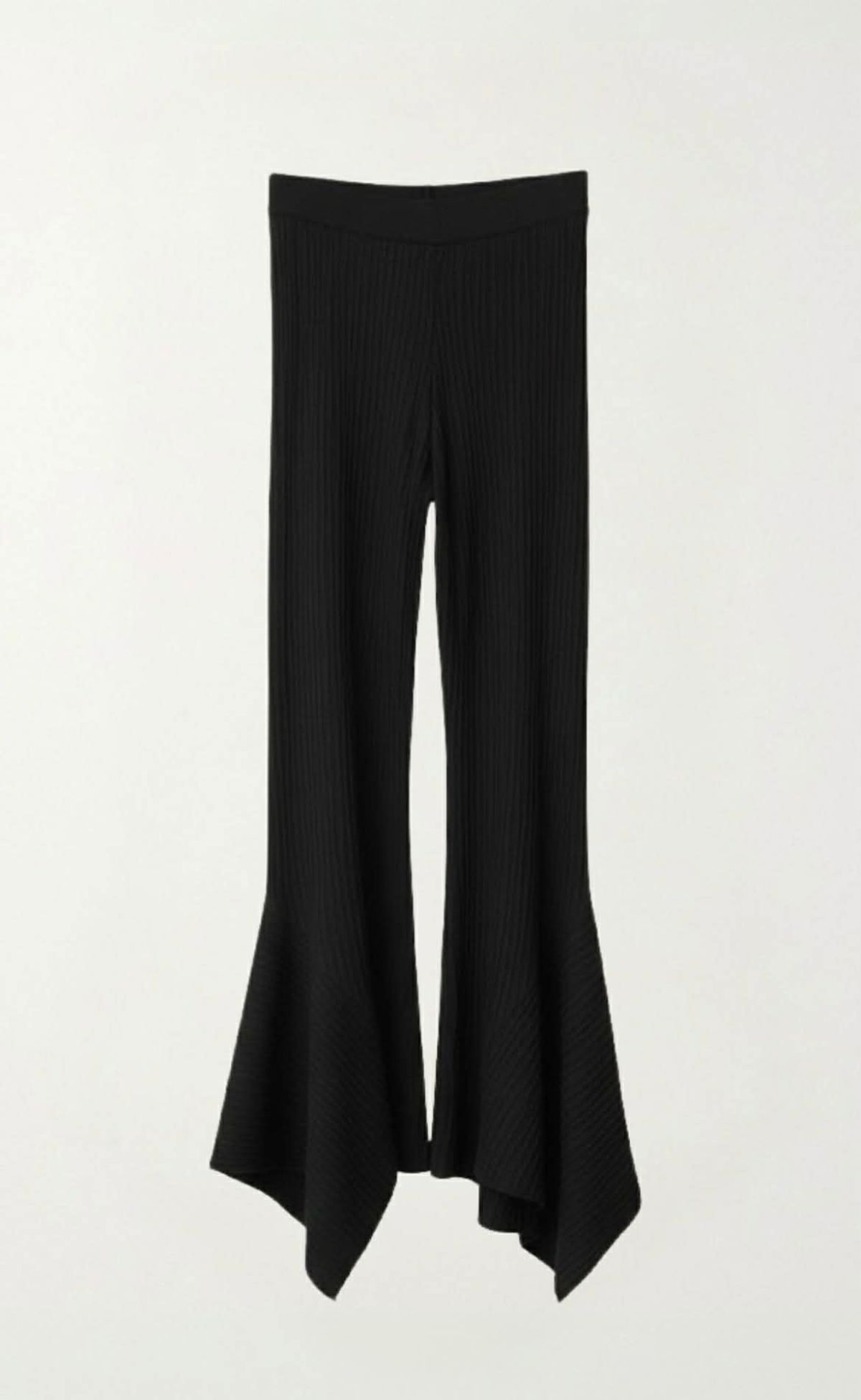 Πλεκτό παντελόνι καμπάνα από ελαστικό νήμα EcoVero βισκόζης με ανάγλυφη nervure πλέξη. Αγκαλιάζει τη σιλουέτα μέχρι το γόνατο, όπου ανοίγει σε φαρδύ τελείωμα με ασύμμετρα“panel”. Η ελαστική του πλέξη εξασφαλίζει άνετη εφαρμογή, ενώ το εντυπωσιακό τελείωμα προσθέτει θεατρικότητα στο look διατηρώντας τη minimal αισθητική της συλλογής. Ένα statement κομμάτι που συνδυάζει χαρακτήρα και ευελιξία, ιδανικό για ξεχωριστές εμφανίσεις.