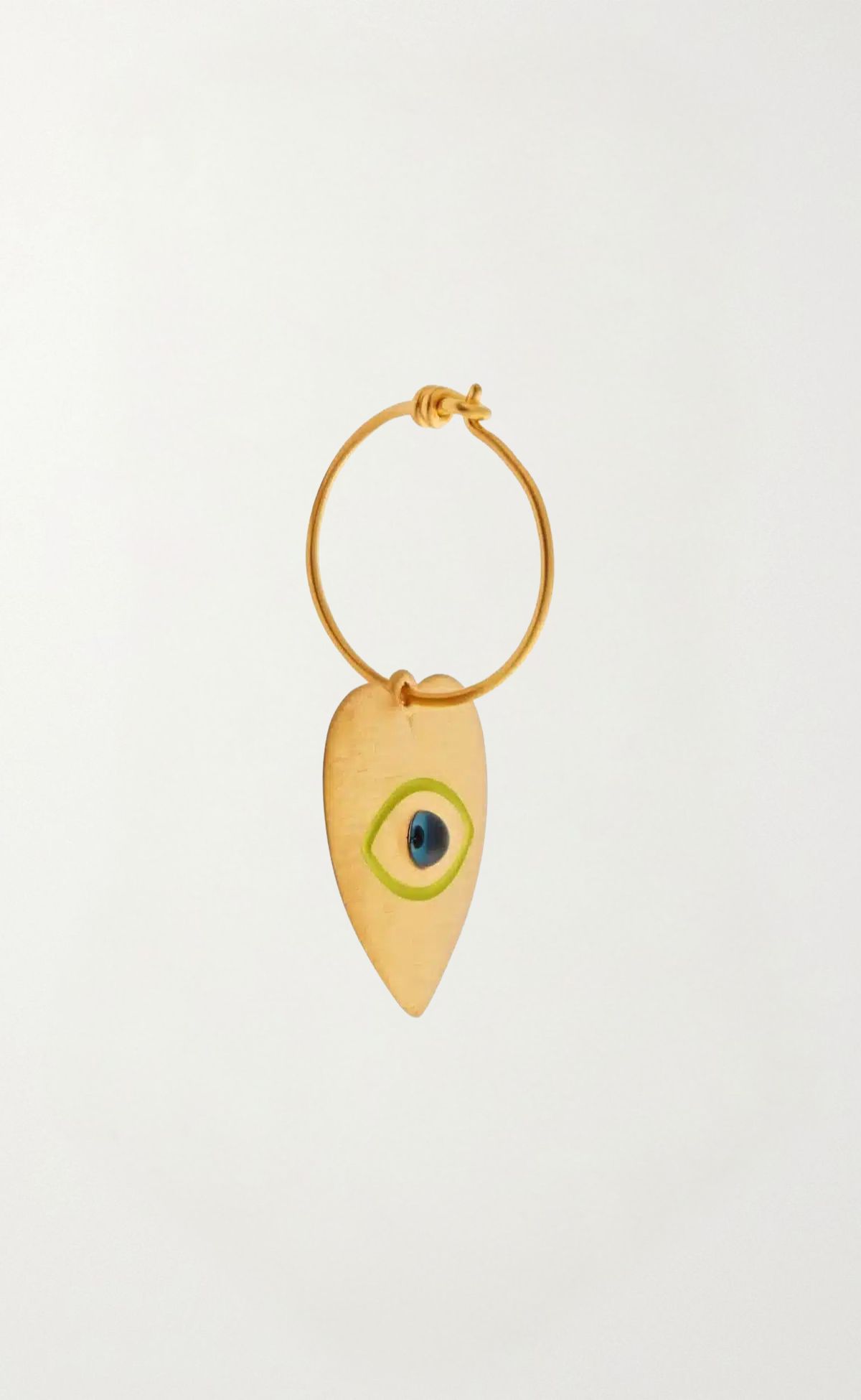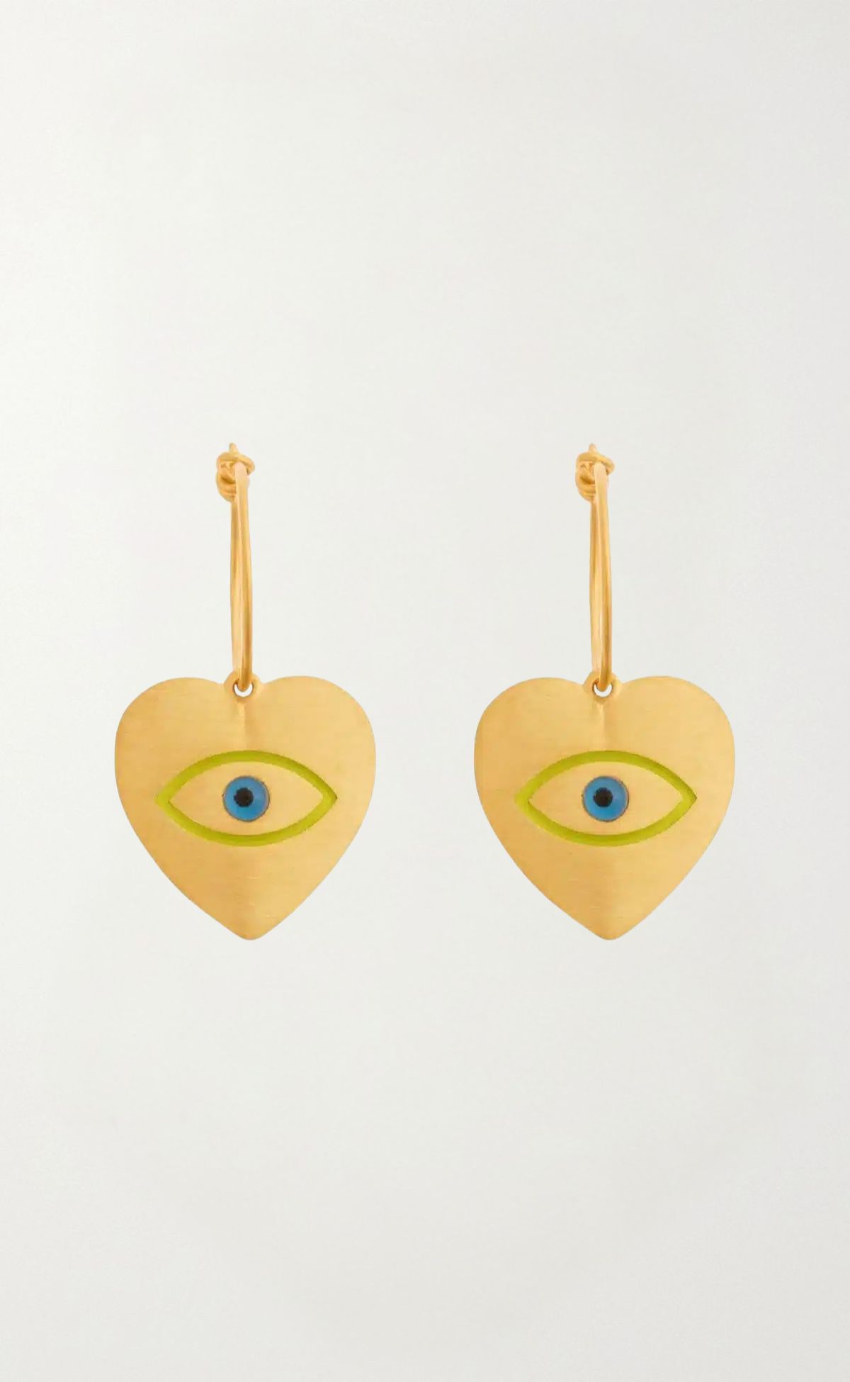 Λεπτοί κρίκοι από ασήμι sterling, επιχρυσωμένοι με Vermeil, με καρδιά σε σατινέ φινίρισμα. Στο κέντρο της καρδιάς υπάρχει μπλε μάτι με νέον περίγραμμα.