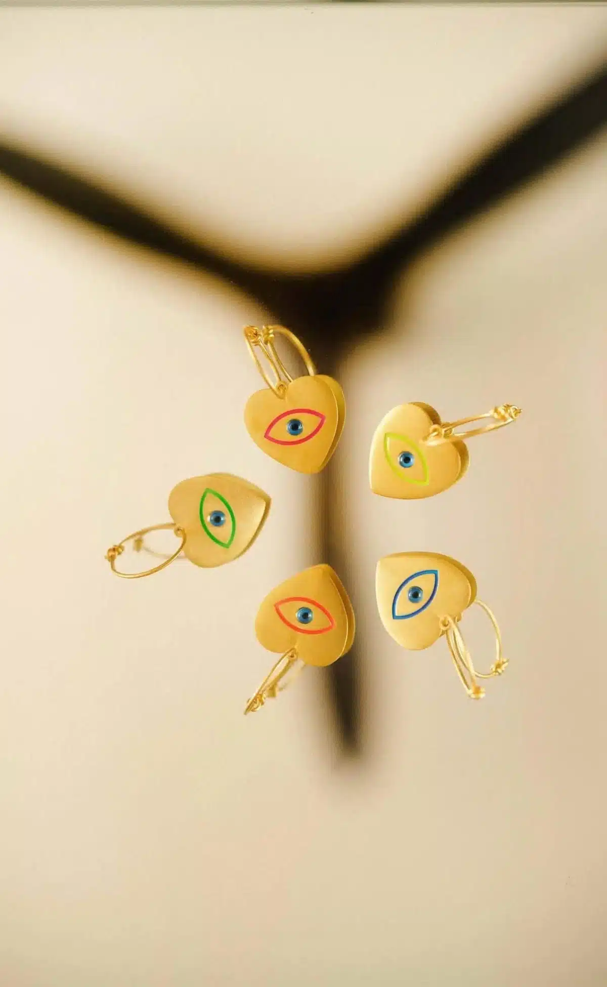 Λεπτοί κρίκοι από ασήμι sterling, επιχρυσωμένοι με Vermeil, με καρδιά σε σατινέ φινίρισμα. Στο κέντρο της καρδιάς υπάρχει μπλε μάτι με νέον περίγραμμα.