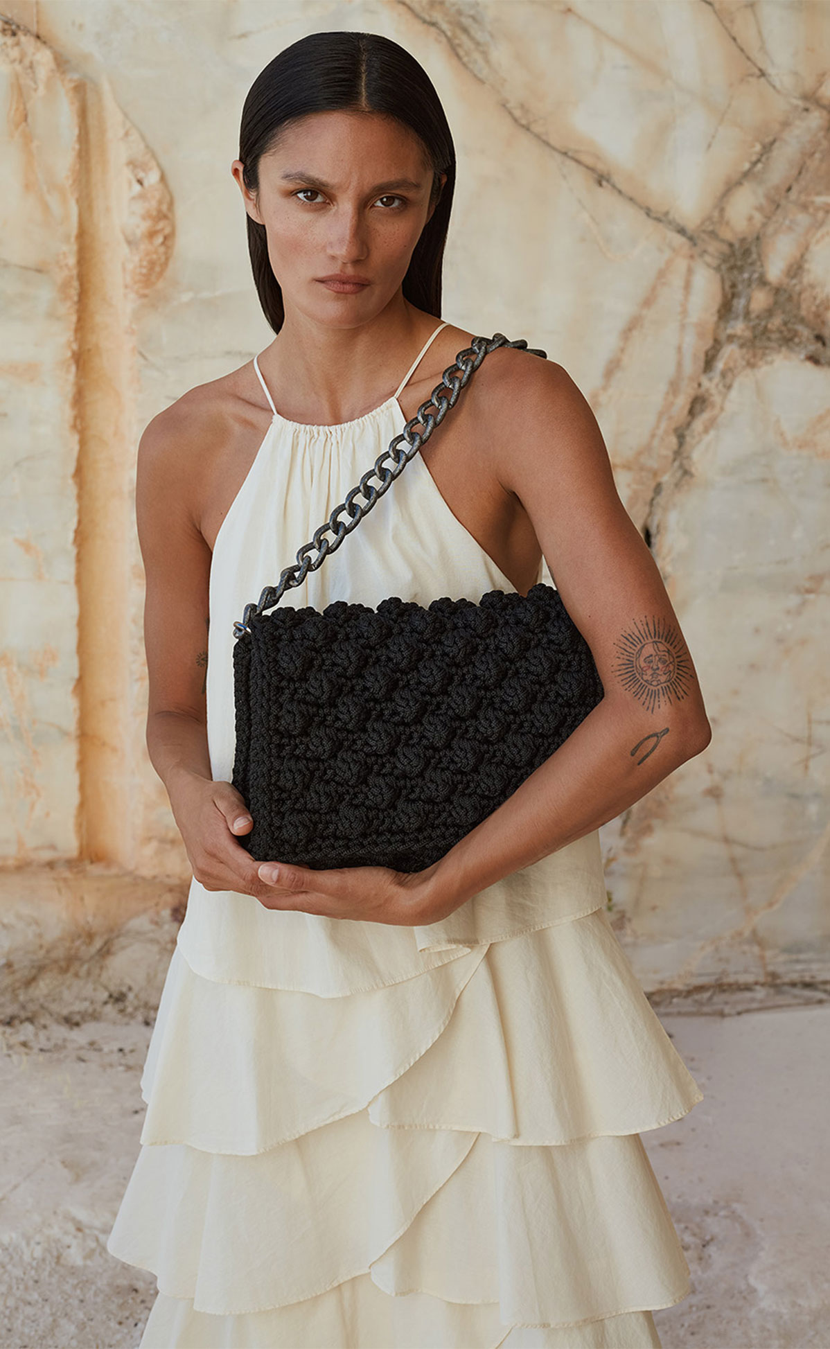 Μια μοντέρνα, μεσαίου μεγέθους τσάντα ώμου που θα σας κάνει να ξεχωρίζετε. Η καλύτερη επιλογή για μια ξεχωριστή εμφάνιση από το πρωί μέχρι το βράδυ. Είναι χειροποίητη από πλεκτό ύφασμα με μεταλλικό νήμα υψηλής ποιότητας και το εσωτερικό της είναι πλήρως επενδεδυμένο.