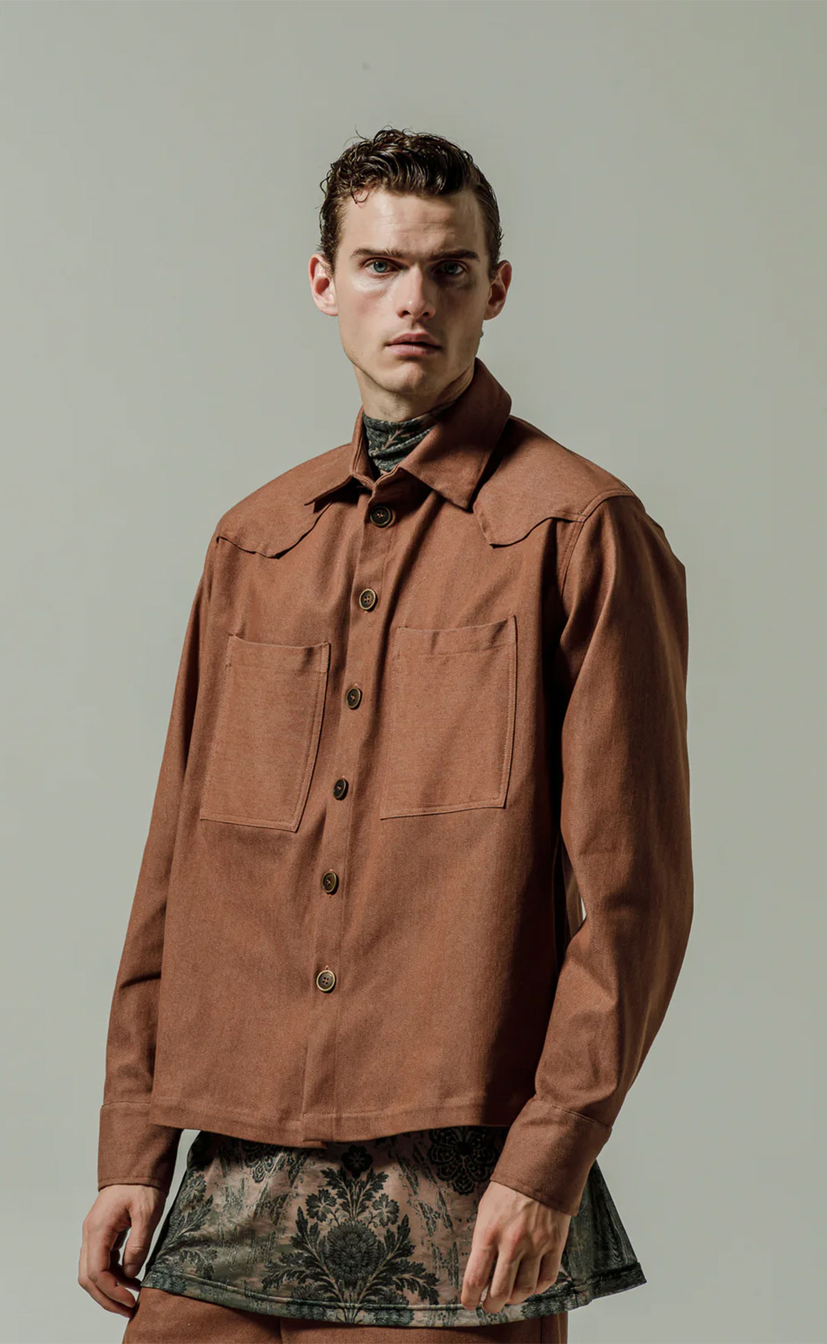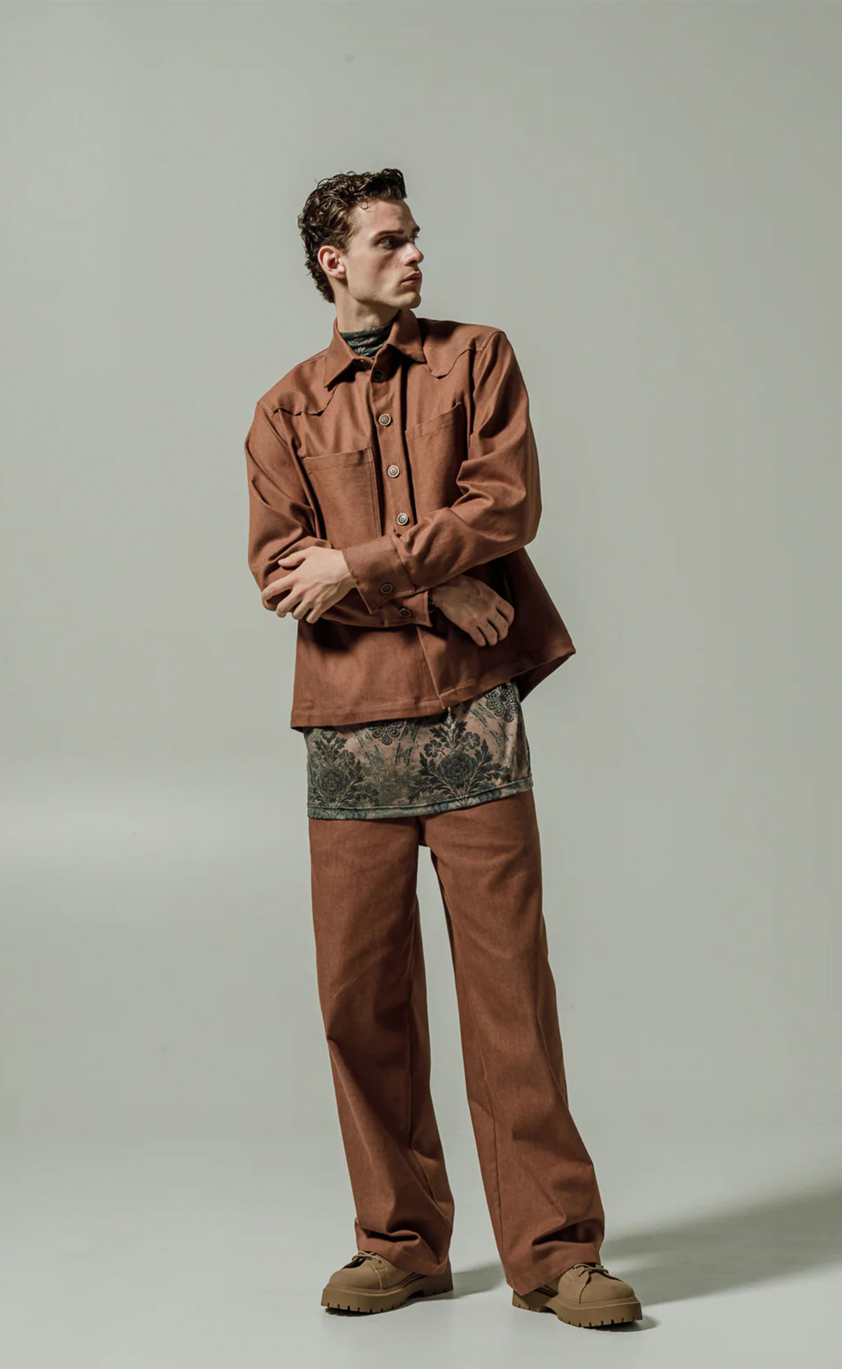 Ένα τζιν πουκάμισο σε ζεστό καφέ με καθαρή, δομημένη γραμμή. Κατασκευασμένο από ανθεκτικό βαμβάκι, συνδυάζει αντοχή με εκλεπτυσμένη απλότητα. Ο μινιμαλιστικός σχεδιασμός διατηρεί το κομμάτι ευέλικτο και μοντέρνο. Ένα διαχρονικό layer που συνδυάζει casual άνεση με διακριτική κομψότητα.