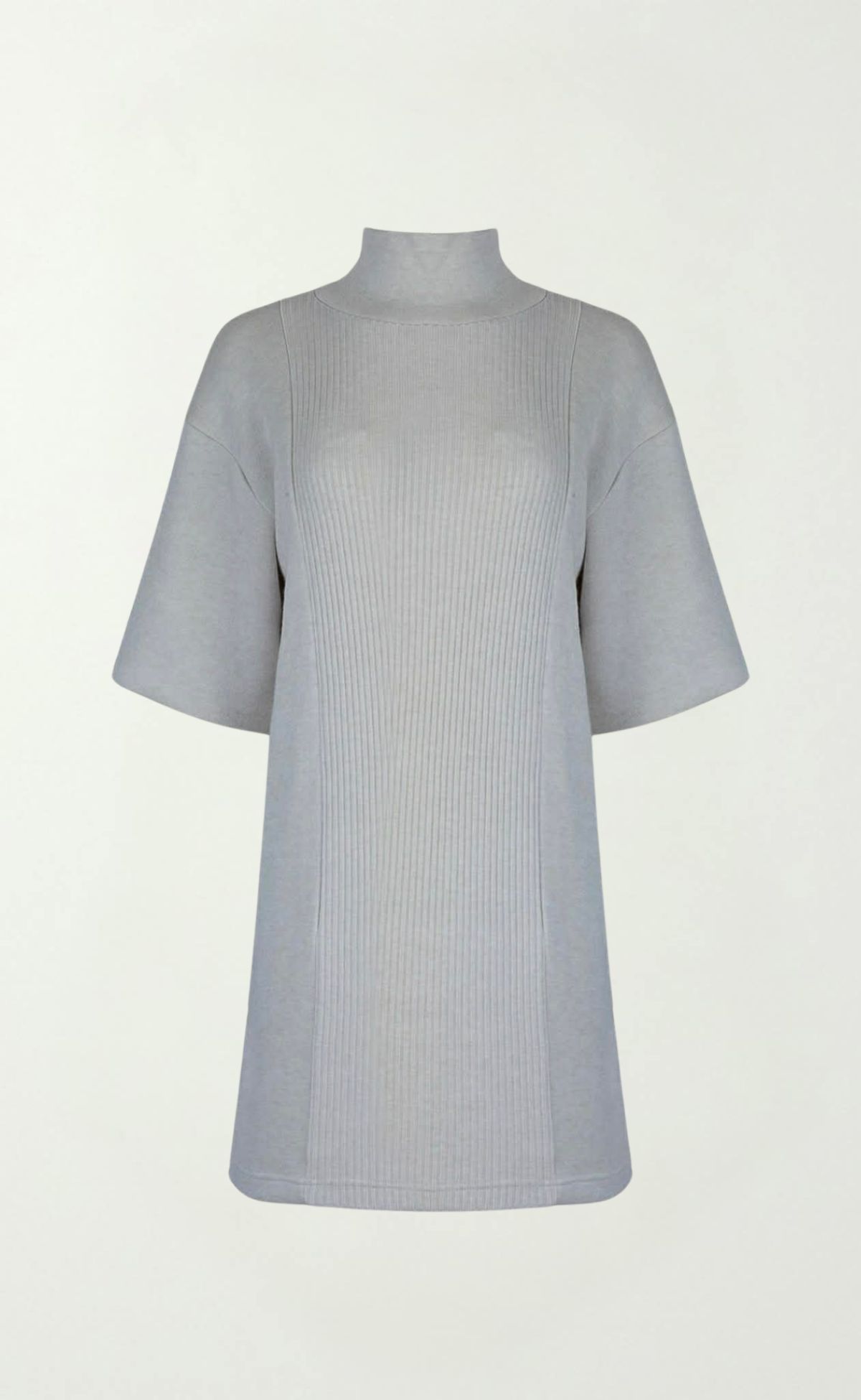 A boxy mini dress made from soft, fluffy fabric, featuring subtle ribbed detailing down the center front and back. It has 3/4 sleeves and a relaxed, comfortable fit that gently flows around the body, offering freedom of movement. Ideal for cozy moments at home or quiet days, this piece blends comfort with effortless style.