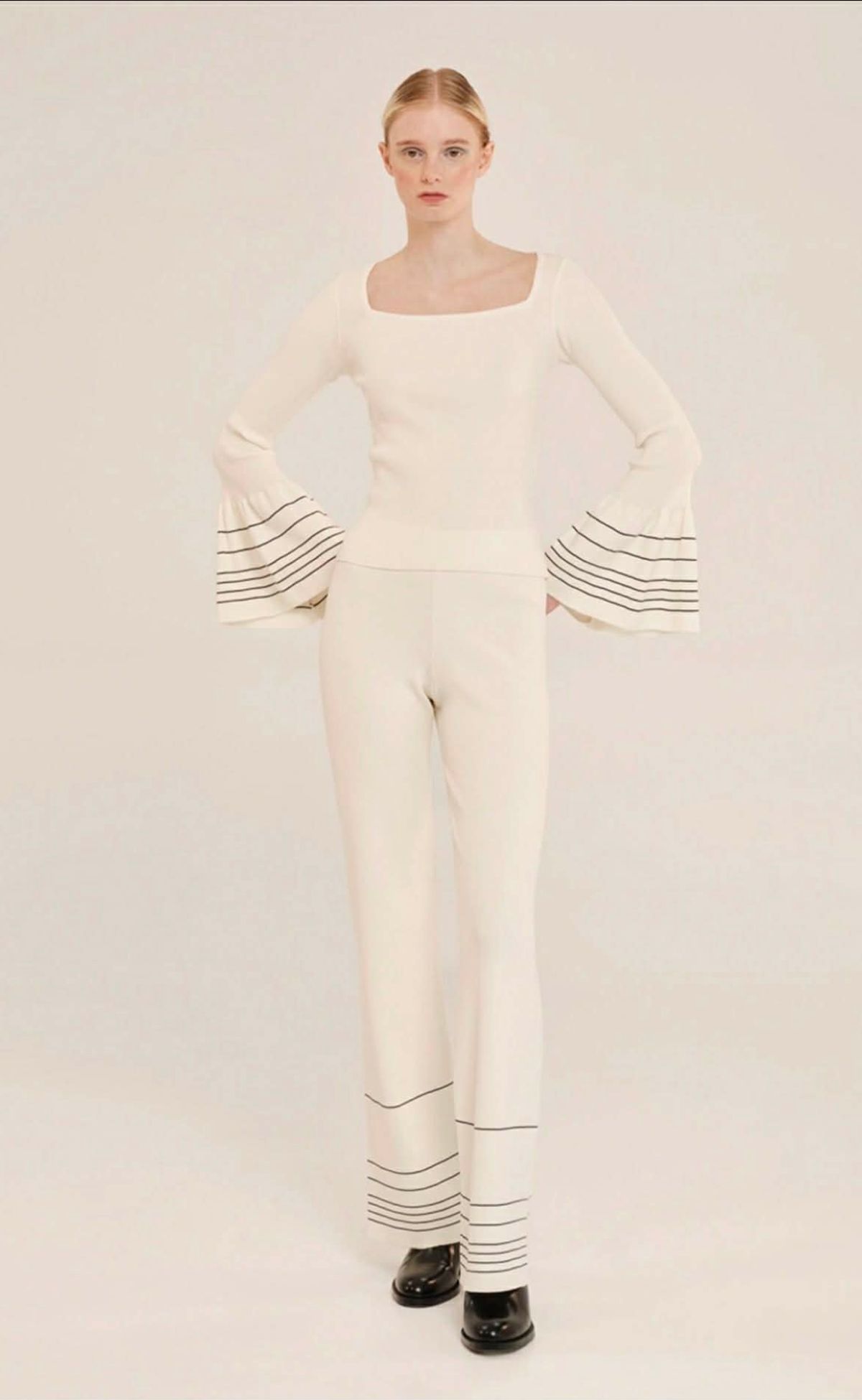 Knit blouse crafted from soft EcoVero viscose yarn in a ribbed knit. It features a figure-hugging silhouette while the stretch knit ensures absolute comfort. Designed with long bell shaped sleeves and a square neckline at the front it features subtle stripes along the lower part that elevate its minimal design, adding a refined touch of detail. Casual yet polished, this piece is effortlessly versatile and ideal for everyday outfits.