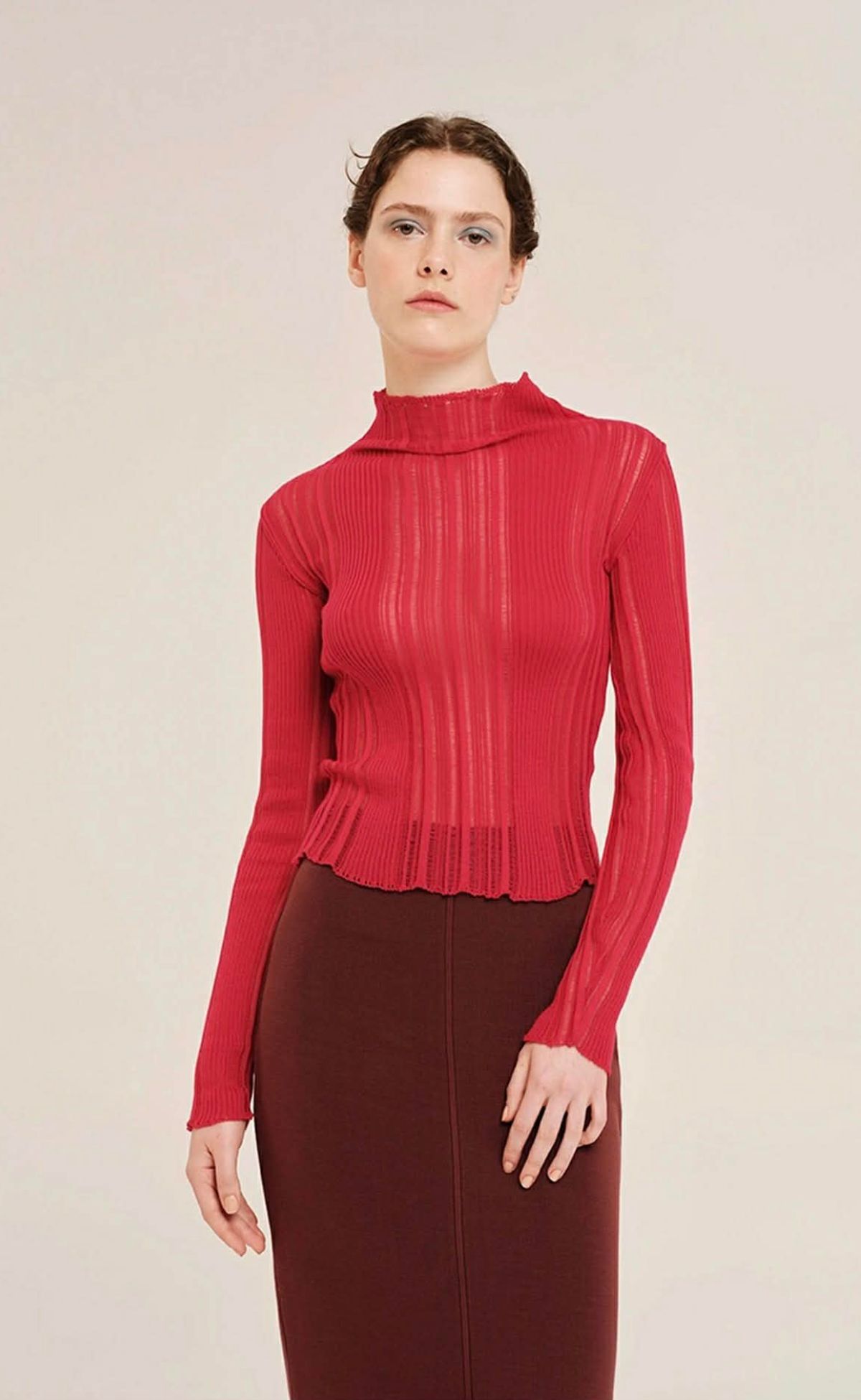 KNIT LONGSLEEVED BLOUSE WITH HIGH-NECK CHARMING RED