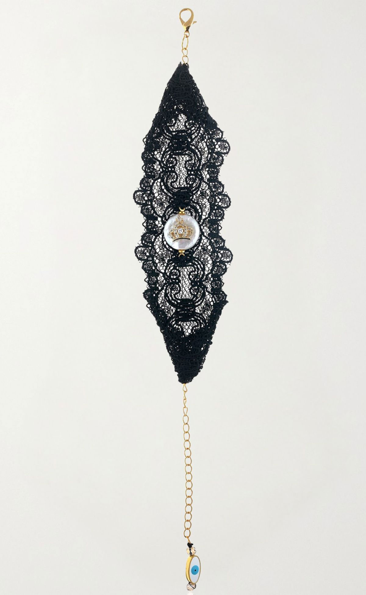 Handmade lace bracelet with freshwater pearl element and gold-plated clasp.