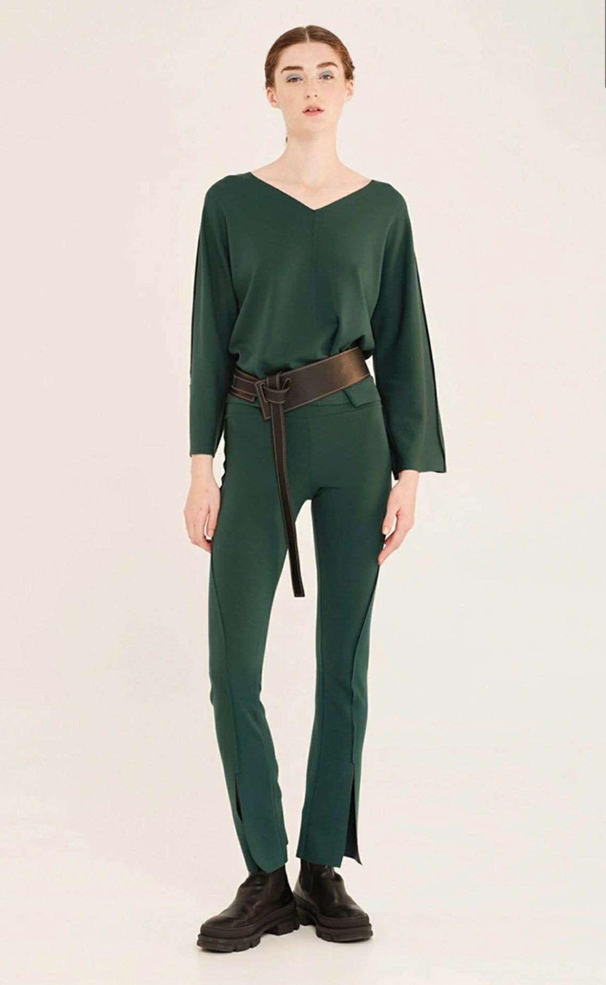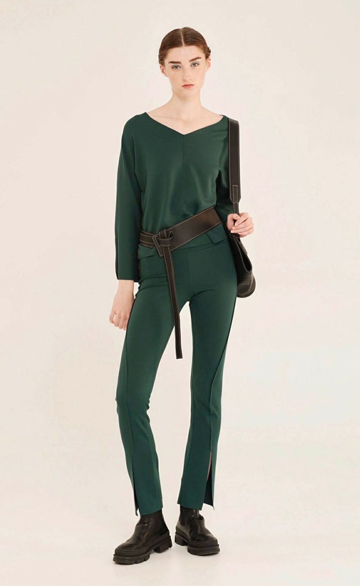 Wide leather belt with a distinctive geometric fastening. It features a slit through which a slim strap is crosses and is secured by being tied. A statement accessory with architectural elements — perfect for stylish winter looks that stand out.