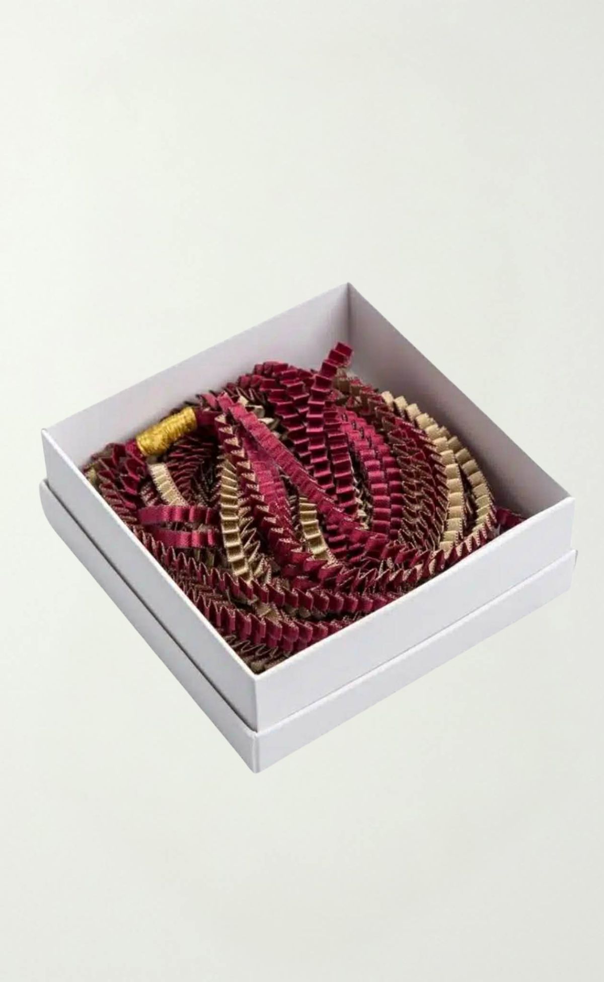 This statement necklace will make every look unique! It is made of pleated fabric and the way it adorns the neck or the top of the garment varies depending on the combinations of colours and shine. It is very lightweight giving air and style to every step. It has a magnet that closes, making it a very easy-to-wear piece that you can combine with your dressy looks, in the office, or with your everyday casual look. NECKLACE PACKAGING: White cardboard box size 9x9x4cm with a self-adhesive label on the lid, with a photo of a detail of the necklace, the color code and the name of the designer Alexandra Tsoukala.