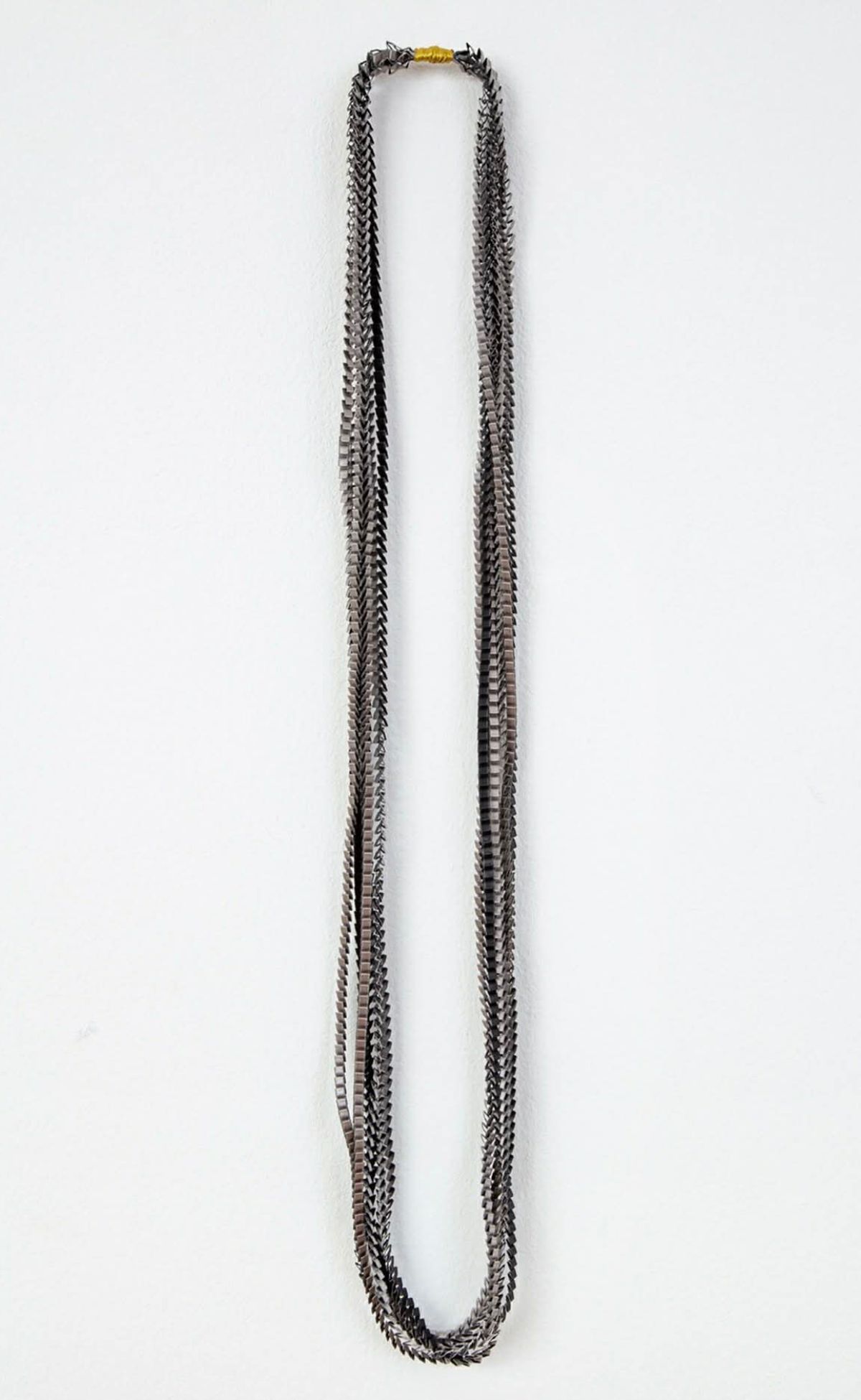 This statement necklace will make every look unique! It is made of pleated fabric and the way it adorns the neck or the top of the garment varies depending on the combinations of colours and shine. It is very lightweight giving air and style to every step. It has a magnet that closes, making it a very easy-to-wear piece that you can combine with your dressy looks, in the office, or with your everyday casual look. NECKLACE PACKAGING: White cardboard box size 9x9x4cm with a self-adhesive label on the lid, with a photo of a detail of the necklace, the color code and the name of the designer Alexandra Tsoukala.