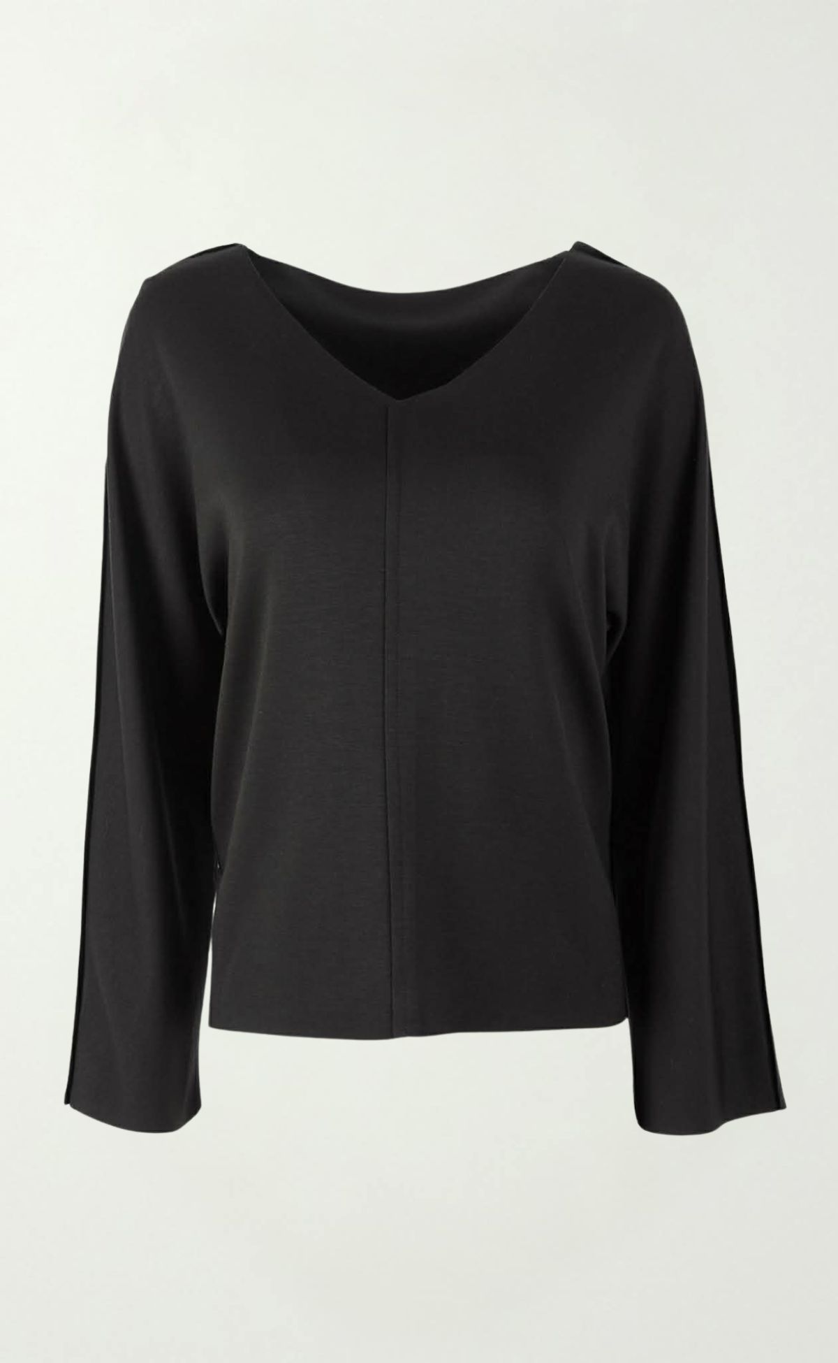 Boxy top crafted from soft, stretchy scuba fabric. It has a relaxed fit, scoop neckline, V-shaped back, and 3/4 length sleeves. It can be worn both ways, offering styling flexibility. Comfortable and easy to wear, it’s a key piece for the winter wardrobe and a versatile base for multiple looks.
