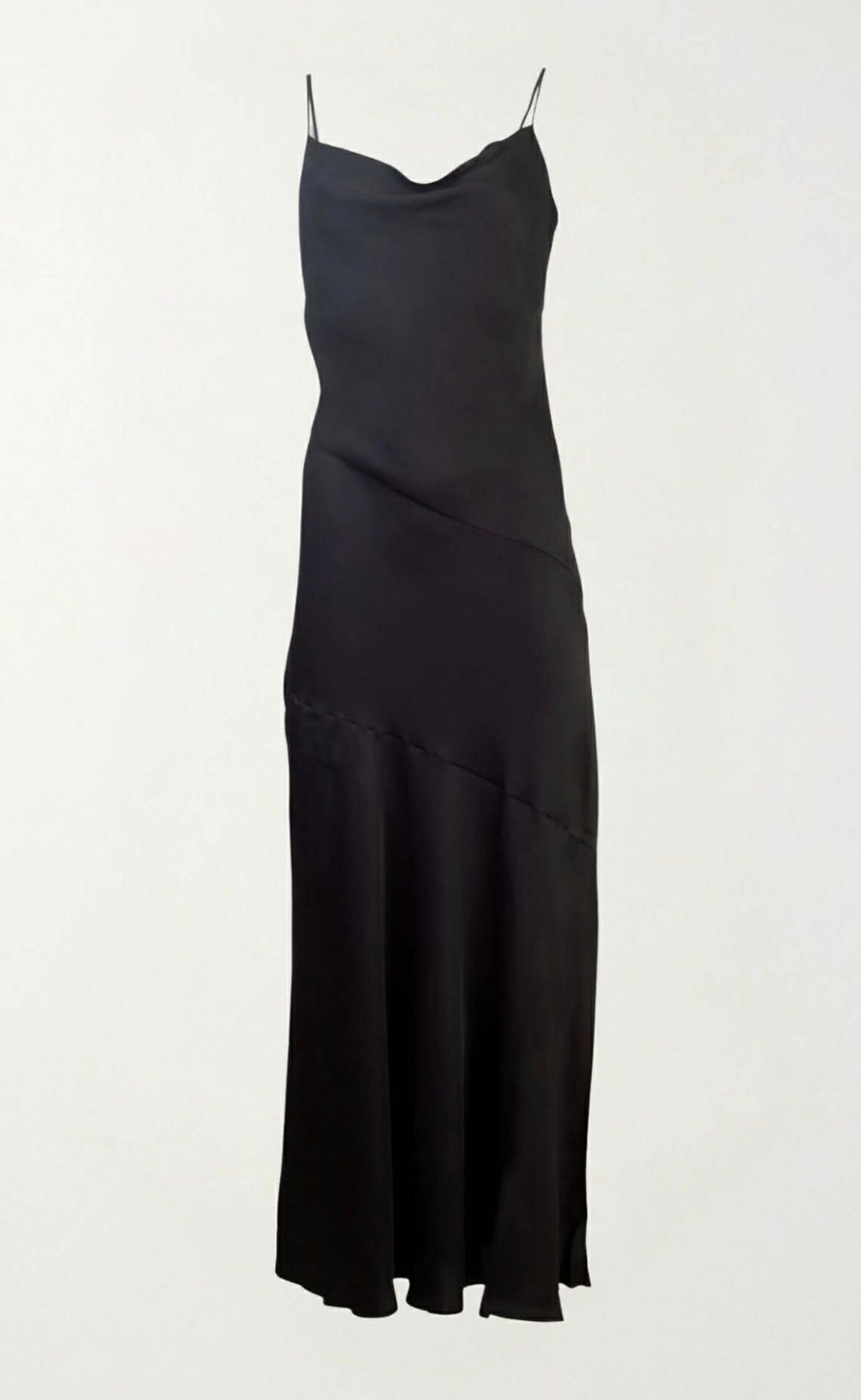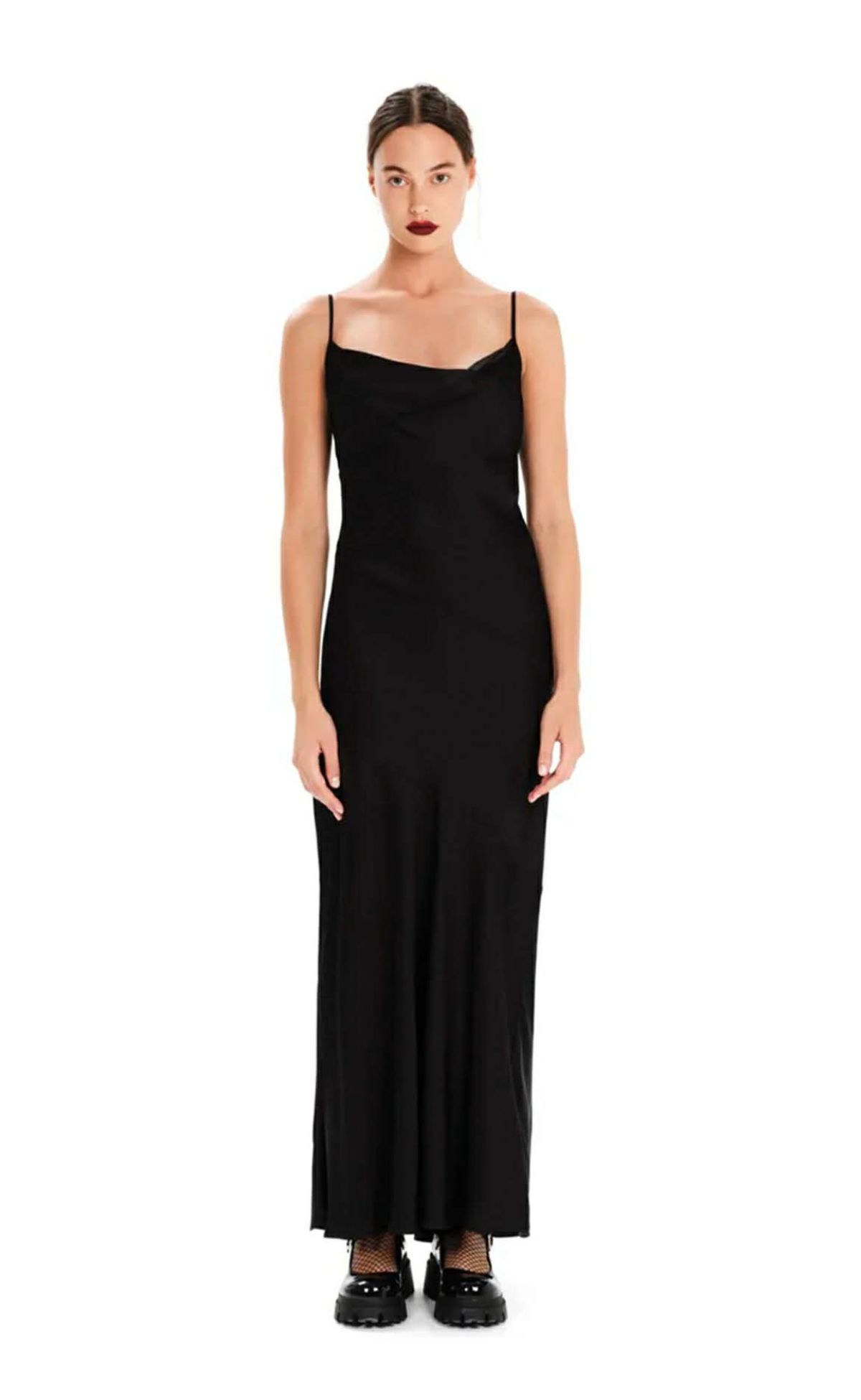 Maxi dress with thin straps and a draped neckline made of Ecovero viscose in a straight line.Uniqueness and elegance combined in a dress with a silky texture.