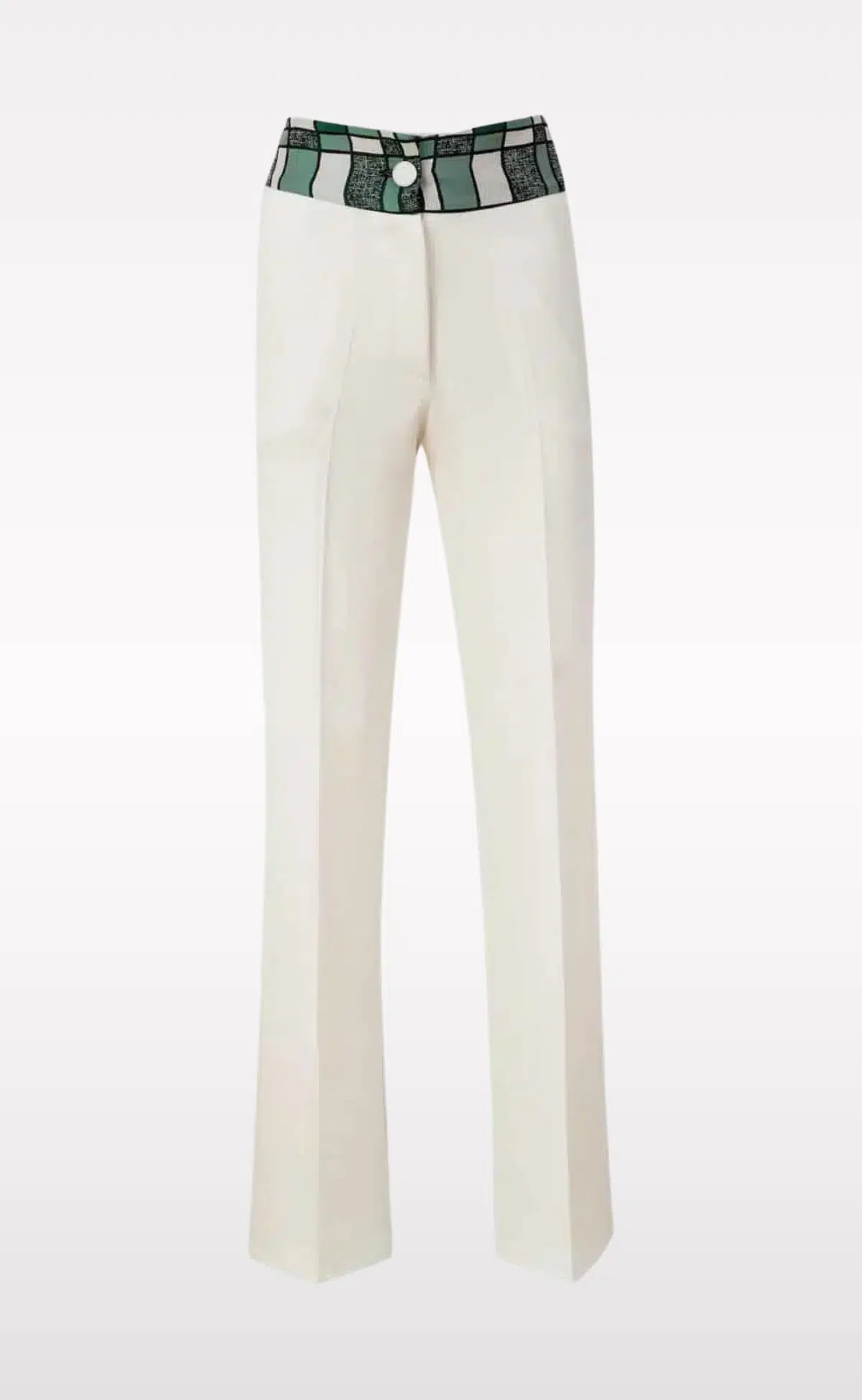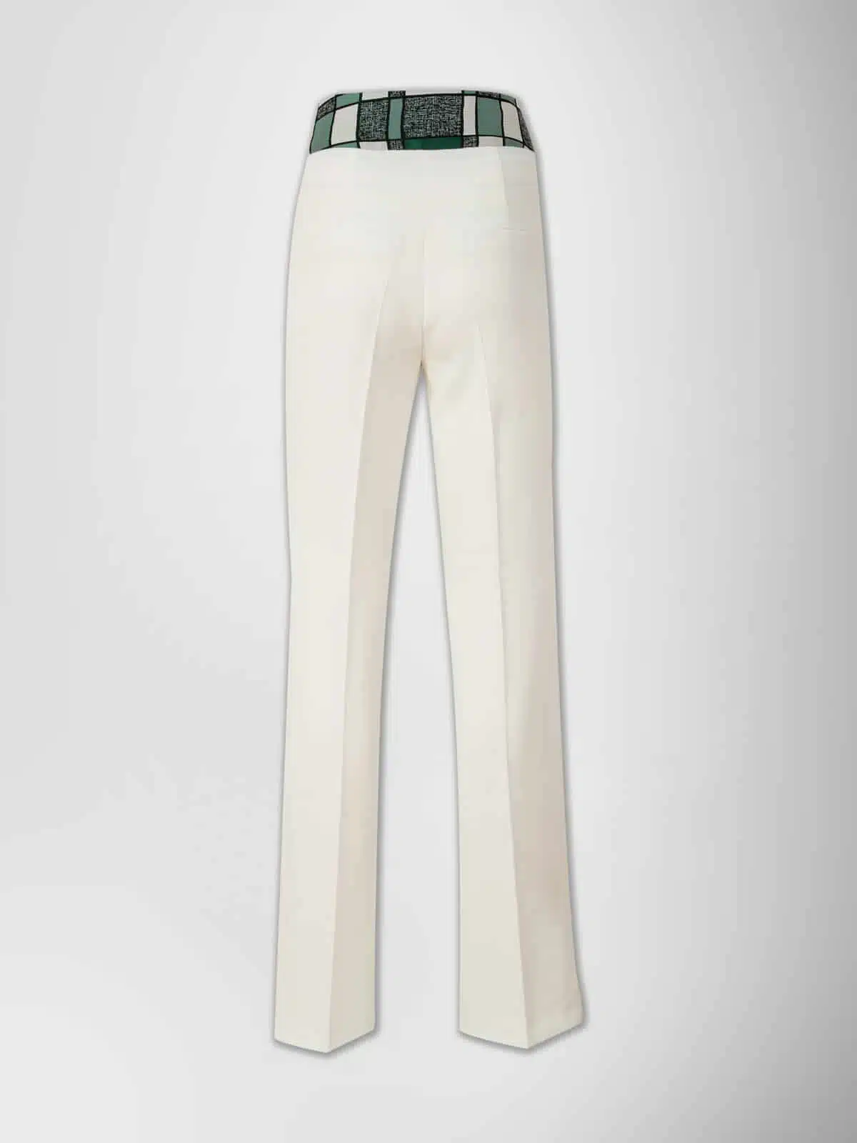 These flared pants feature a distinctive “Bauhaus”-inspired print with green, black, and white geometric patterns at the waist, creating a modern and sophisticated aesthetic. They can be styled as a complete suit with the matching blazer or paired with a crepe turtleneck or a knitted sweater for a versatile look.