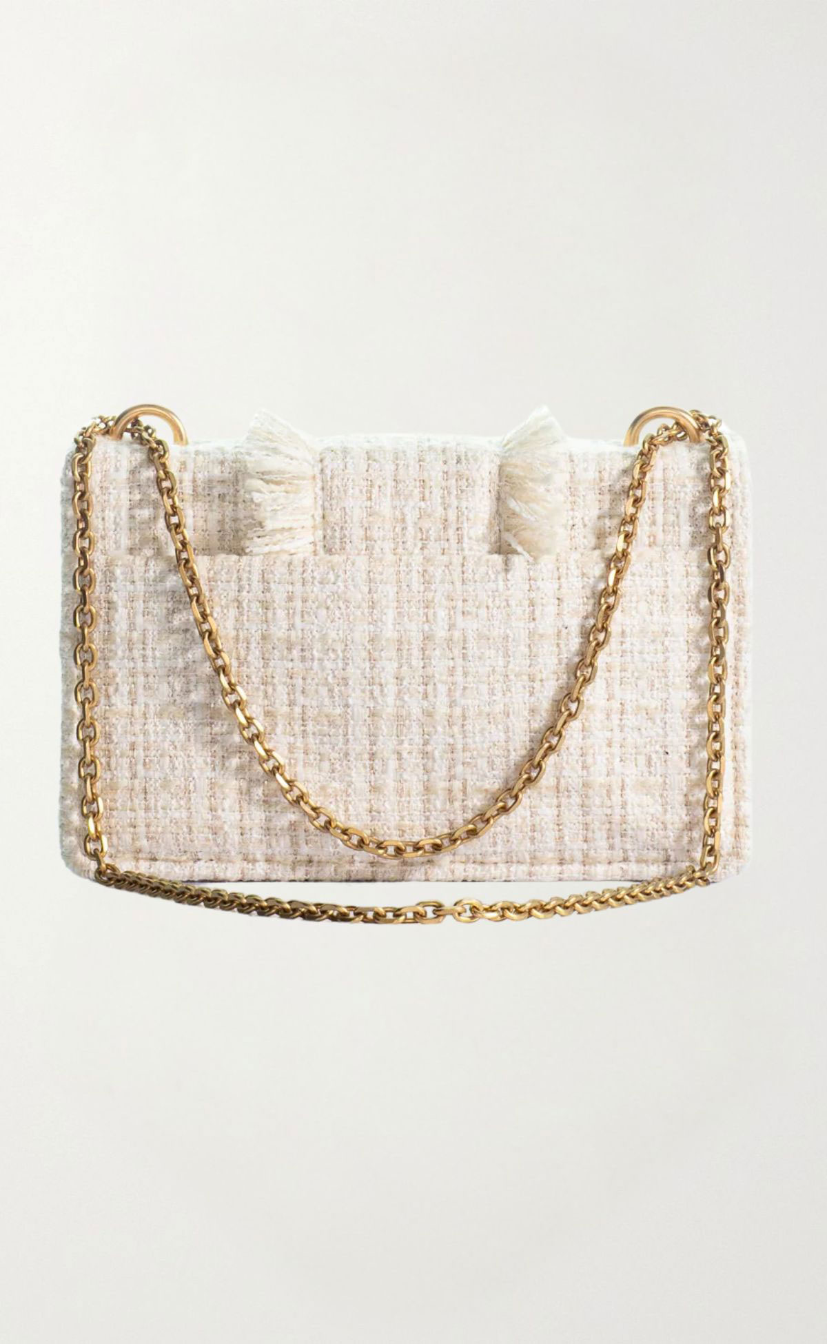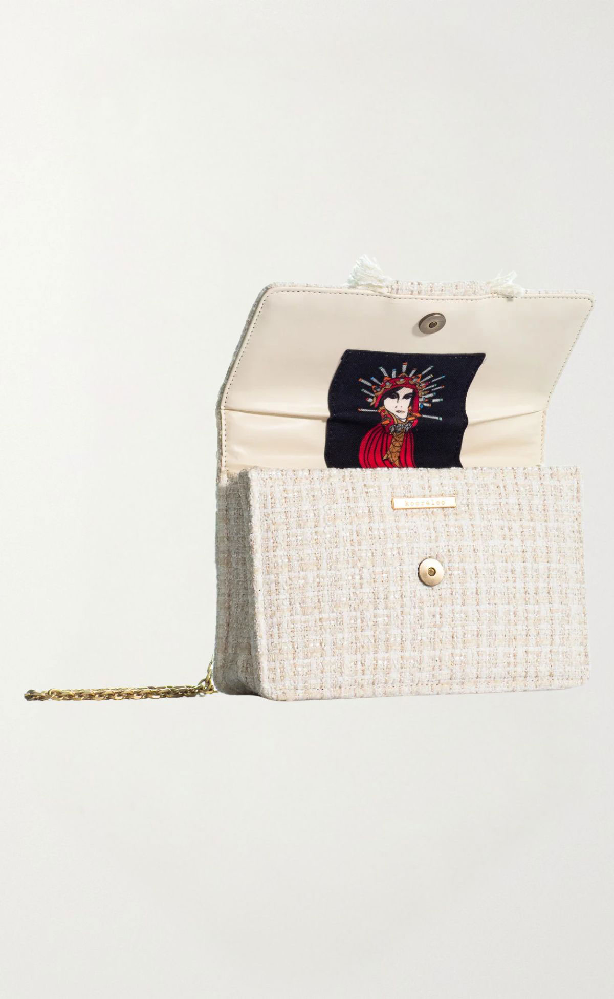 The Lucerne Bag – Timeless Elegance, Modern CharmA statement of sophistication, the Lucerne Bag is crafted from luxurious off-white tweed, exuding refined elegance with a contemporary edge. The gold-tone metal chain adds a touch of opulence, seamlessly complementing its textured design.Inside, Kooreloo’s trademark lining, featuring the iconic goddess Athena, speaks to the brand’s fusion of heritage and artistry. Adorned with Kooreloo’s signature metal emblem, this piece is a celebration of craftsmanship and identity.Each bag comes with a branded pouch, ensuring its care and longevity—because true style is meant to last